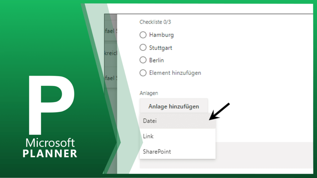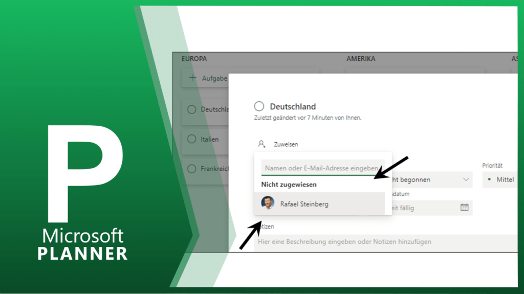 Hier können Sie der Aufgabe, die entsprechende Person zuweisen. Falls die Person nicht vorgeschlagen wird, dann die E-Mail-Adresse eingeben. Sie können auch nachträglich die Personen per Drag-and-drop den Aufgaben zuordnen.