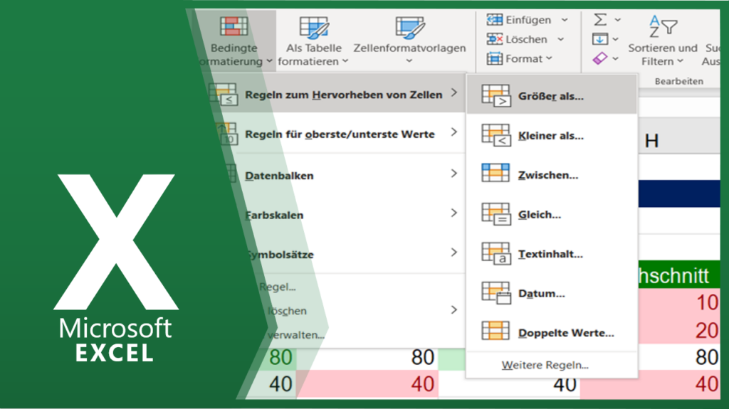 Sollen Werte oberhalb des Wertes 50 hervorgehoben werden, dann wählen Sie die Funktion BEDINGTE FORMATIERUNG / REGELN ZUM HERVORHEBEN VON ZELLEN / GRÖßER ALS aus und geben 50 ein. Sollen aus dem markierten Bereich die Werte, die unter dem Durchschnitt liegen, hervorgehoben werden, dann verwenden Sie hierzu die Funktion BEDINGTE FORMATIERUNG / REGELN FÜR OBERSTE/UNTERSTE […]