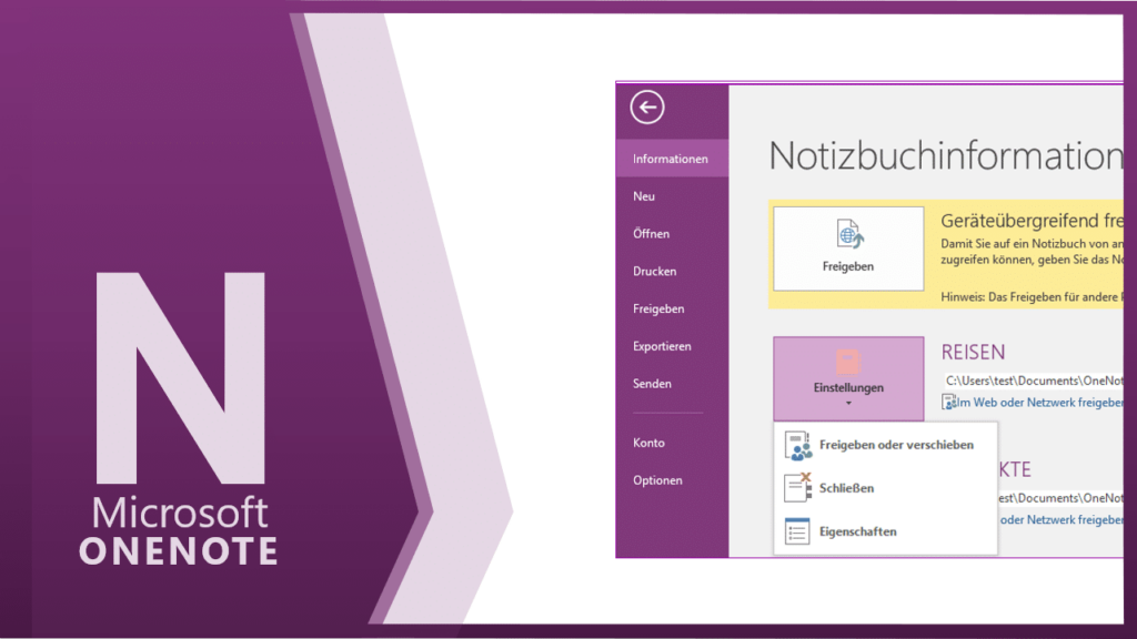 Über DATEI / INFORMATIONEN können Sie jedes Ihrer Notizbücher individuell einstellen.