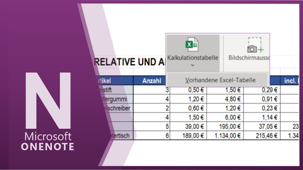 Sie können direkt über OneNote bestehende Excel Tabellen einfügen. EINFÜGEN / KALKULATIONSTABELLE / VORHANDENE EXCEL-TABELLE Im aufgehenden Fenster können Sie aus drei Optionen entscheiden.