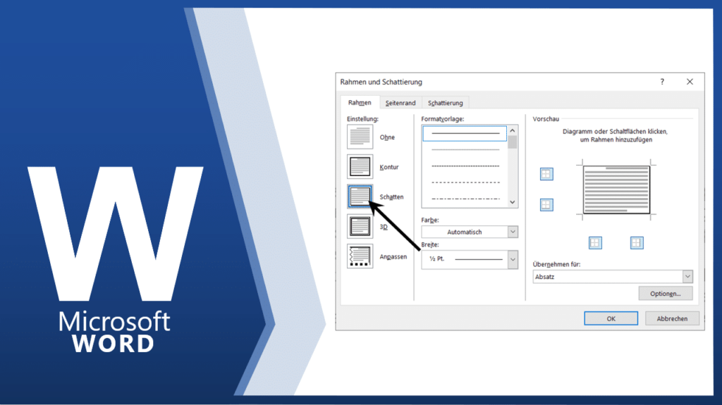Über die Registerkarte RAHMEN, können Sie Ihrem Rahmen durch die Funktion SCHATTIERT einen Schatten zuordnen. Beispiel: Schattierter Rahmen