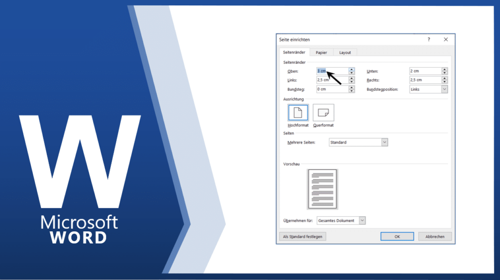 Mit der Schaltfläche SEITENRÄNDER / BENUTZERDEFINIERTE SEITENRÄNDER können Sie alle Ränder Ihres Blattes einstellen.
