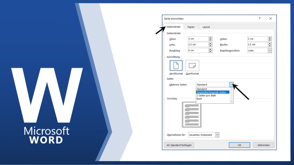 Möchten Sie Ihr Dokument auf beiden Seiten ausdrucken, dann wählen Sie in der Registerkarte SEITENRÄNDER die Formatierung GEGENÜBERLIEGENDE SEITEN. Somit werden die Ränder RECHTS und LINKS auf INNEN und AUßEN eingestellt.