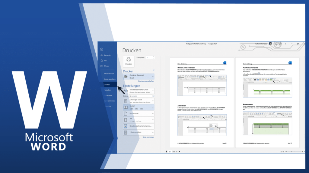 Bevor Sie ein Dokument ausdrucken, können Sie den Ausdruck in der Vorschau begutachten. Die Seitenansicht erhalten Sie über die Schaltfläche DATEI / DRUCKEN.