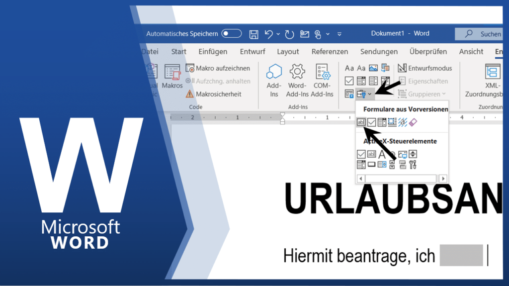 Im Beispiel wird ein Formular für einen Urlaubsantrag erstellt. Über die Schaltfläche VORVERSIONSTOOLS / TEXTFELD in der Gruppe STEUERELEMENTE, können Sie einfache Textfelder einfügen. Optionen für Textformularfelder Durch das Doppelklicken in das eingefügte TEXTFELD gelangen Sie in das Fenster OPTIONEN FÜR TEXTFORMULARFELDER. Hier können Sie dem TEXTFELD einen Standardtext zuordnen. Weitere Optionen Sie können über […]