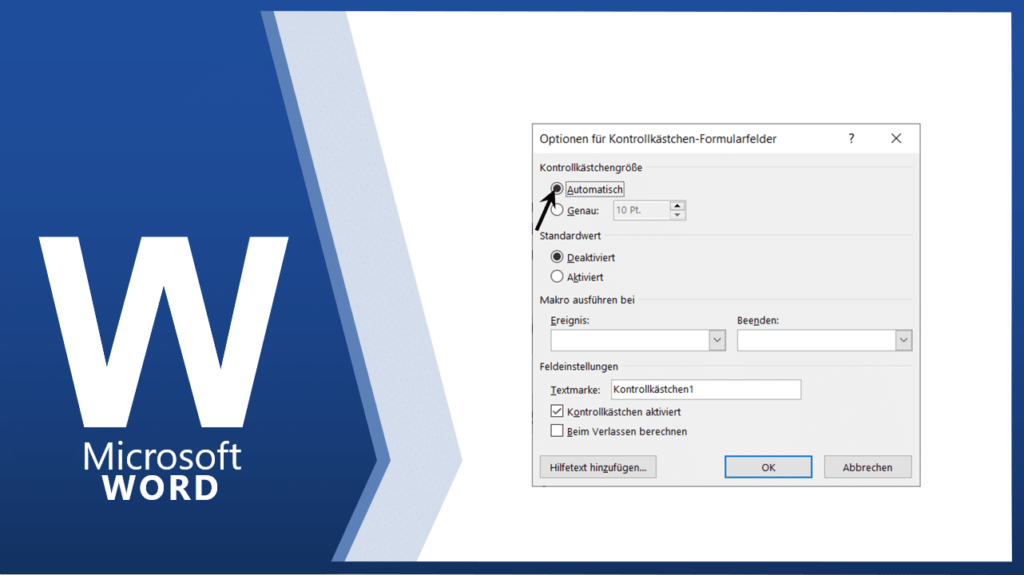Mit Hilfe des KONTROLLKÄSTCHENS bekommt der Benutzer die Möglichkeit auf eine sehr einfache Weise Vorschläge auszuwählen. Kontrollkästchen Optionen Durch das Doppelklicken in das Kontrollkästchen kommen Sie zu den jeweiligen Optionen. Sie können dort die Kontrollkästchengröße anpassen bzw. den Standardwert einstellen.