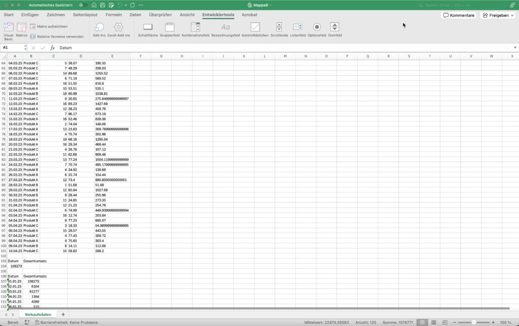 Microsoft Excel ist ein leistungsstarkes Werkzeug zur Datenanalyse und Verwaltung. Eine der nützlichsten Funktionen in Excel ist die Möglichkeit, Makros zu erstellen, die wiederkehrende Aufgaben automatisieren. In diesem Artikel lernen Sie, wie Sie mithilfe von KI ein einfaches Makro erstellen, das die täglichen Umsätze summiert und in einer neuen Spalte darstellt. Wir verwenden die Beispieldaten […]