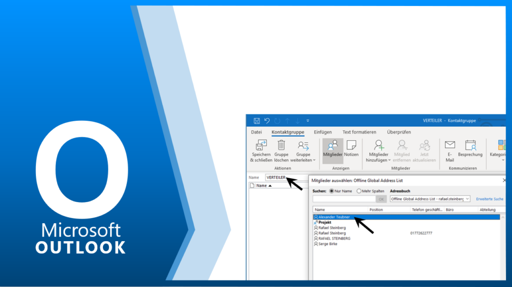 Möchten Sie immer wieder den gleichen Personen eine E-Mail schreiben, dann macht es Sinn sich eine Verteilerliste anzulegen. Über die Schaltfläche START / NEUE KONTAKTGRUPPE erstellen Sie einen neuen Verteiler. Die Personen werden der Verteilerliste über die Schaltfläche MITGLIEDER AUSWÄHLEN zugeordnet. Danach vergeben Sie dem Verteiler einen Namen.
