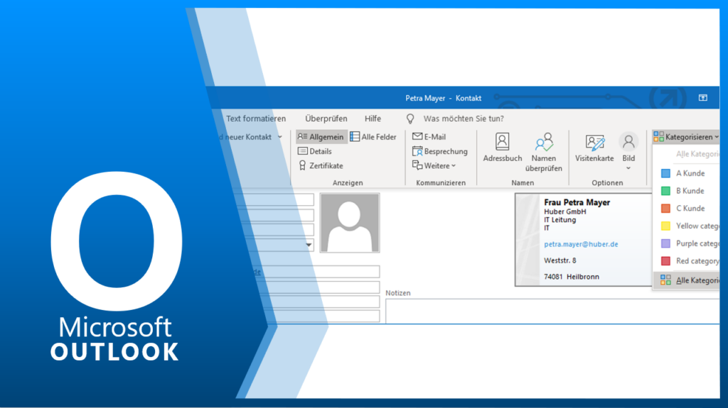 Um Ihre Kontakte besser zu strukturieren, haben Sie im Adressbuch die Möglichkeit den angelegten Kontakten Kategorien zuzuordnen. Mit UMBENNEN können Sie bestehende Kategorien neu betiteln. Über die Schaltfläche NEU haben Sie die Möglichkeit eine neue Kategorie anzulegen. Unter START / AKTUELLE ANSICHT / LISTE können Sie einfach nach den Kategorien sortieren