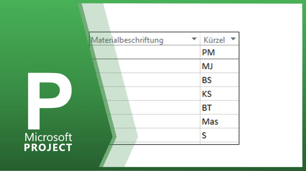Wenn Sie bei der Ressourcenart MATERIAL ausgewählt haben, dann können Sie zusätzlich dieser Ressource eine Beschriftung hinzufügen, wie z.B. eine Bestell- oder Lieferantennummer. In der Spalte Kürzel können Sie die Ressourcen in abgekürzter Form eingeben. Diese Kürzel können Sie sich später im Balkendiagramm anzeigen lassen.