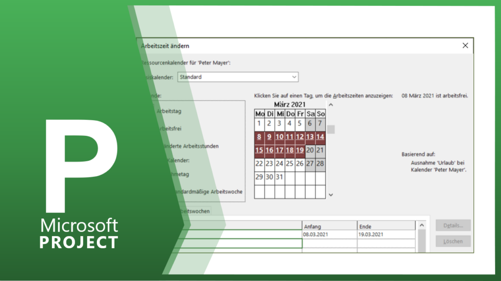 In der Registerkarte ARBEITSZEIT ÄNDERN können Sie alle ressourcenspezifischen Abweichungen zum Standardkalender eingeben. Im Reiter AUSNAHMEN können Sie zum Beispiel den Urlaub oder abweichende Arbeitszeiten, bei denen die Ressource nicht verfügbar ist, eintragen.