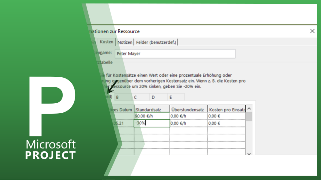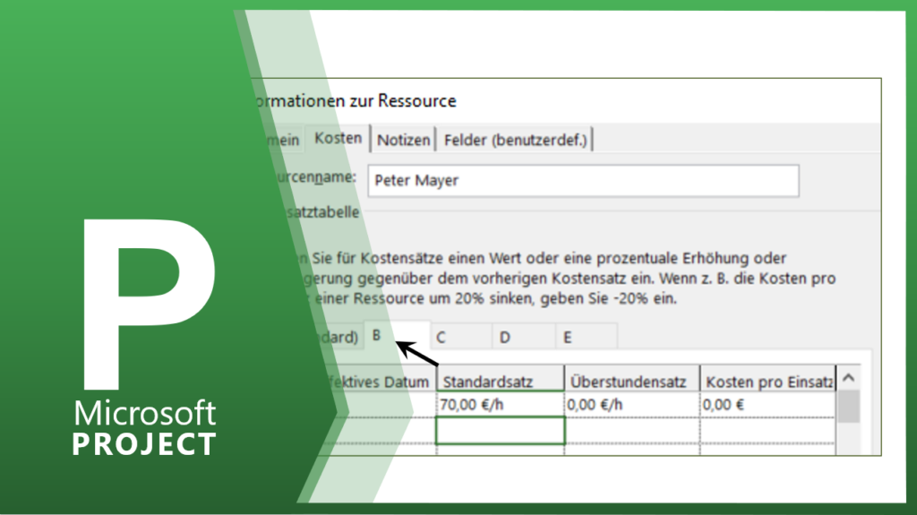 Pro Ressource stehen Ihnen insgesamt 5 Kostensätze zu Verfügung. In den jeweiligen RegisterkartenA bis E können die Sie unterschiedliche Kostensätze eintragen. Für die Tätigkeit B beträgt der Kostensatz von Peter Mayer 70 Euro. Für die Tätigkeit C beträgt der Kostensatz von Peter Mayer 45 Euro.