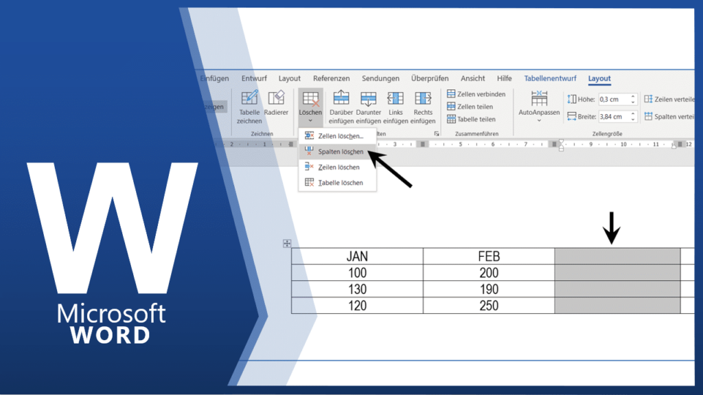 Genauso gehen Sie vor, wenn Sie eine Spalte löschen wollen. Die zu löschende Spalte markieren und die Funktion LÖSCHEN / SPALTEN LÖSCHEN auswählen.