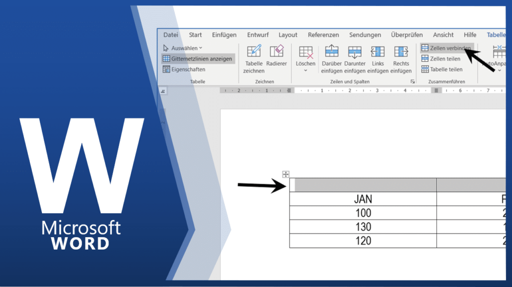 Mit der Funktion ZELLEN VERBINDEN können Sie benachbarte Zellen zu einer Zelle verschmelzen. Zuerst die Zellen markieren und dann die Schaltfläche ZELLEN VERBINDEN auswählen.