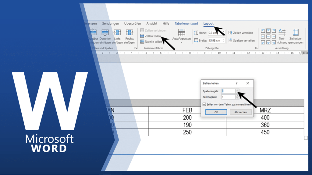 In Word können Sie eine Zelle in mehrere Zellen unterteilen. Über die Schaltfläche ZELLEN TEILEN gelangen Sie in ein Fenster, in dem Sie die SPALTENANZAHL bzw. ZEILENANZAHL eintragen können.