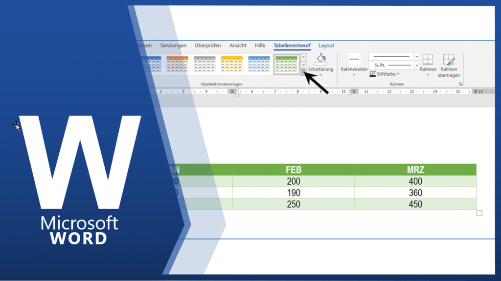 Über die Funktion TABELLENFORMATVORLAGEN können Sie ganz schnell Ihre Tabelle umformatieren. Im Drop-down-Menü WEITERE können Sie unter verschiedenen Formatierungsbeispielen auswählen.
